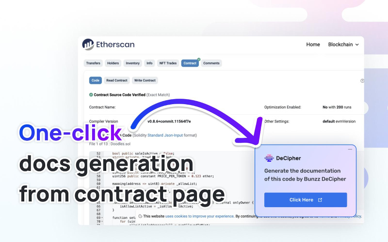 Using DeCipher is incredibly simple: developers can effortlessly generate documentation by copying and pasting the contract’s URL. For those seeking continuous accessibility, DeCipher can be conveniently accessed through the Bunzz Chrome Extension, available on popular Block Explorers like Etherscan.